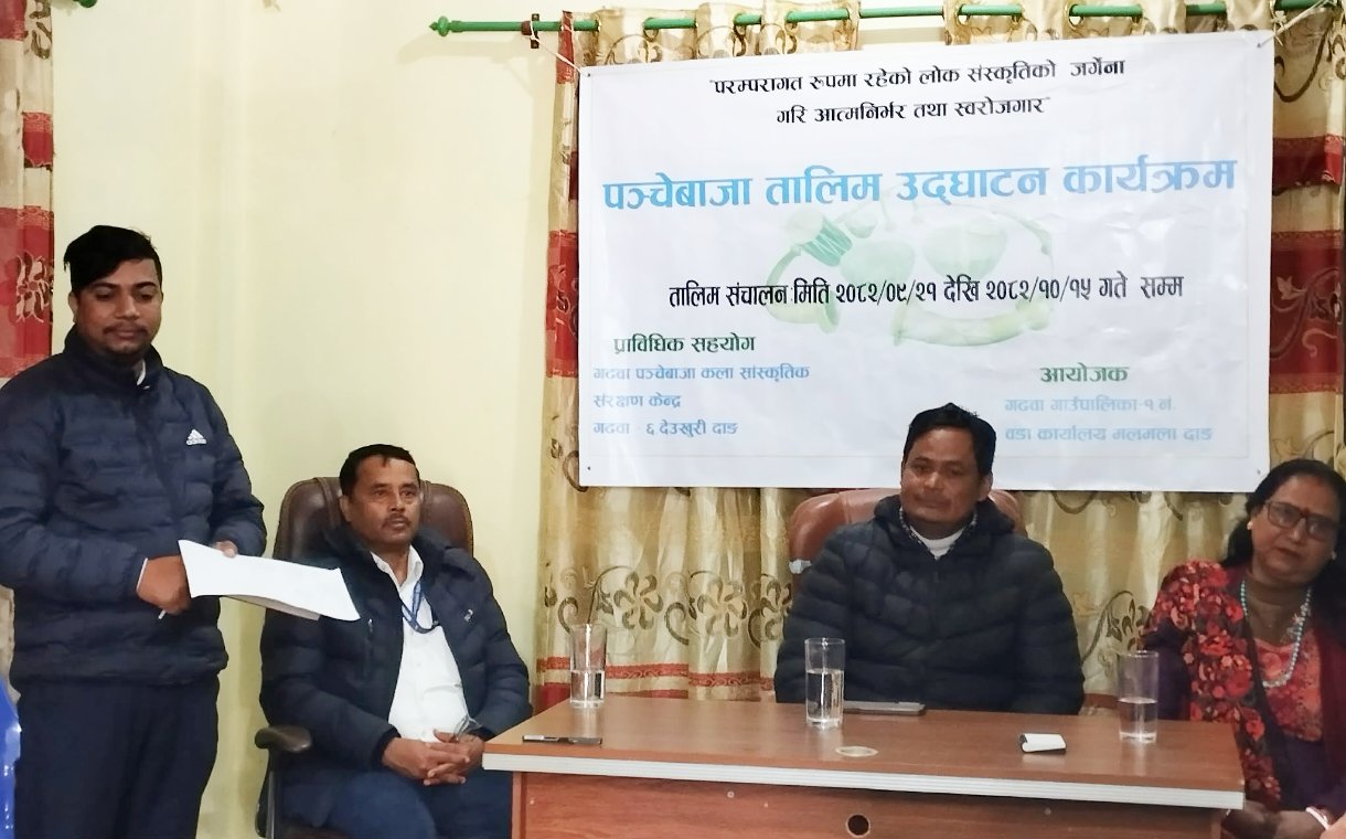गढवा,२४ पुष। परम्परागत रूपमा रहेको लोक संस्कृतिको जगेर्ना गर्दै स्थानीयलाई आत्मनिर्भर र स्वरोजगार बनाउने उद्देश्यका साथ गढवा गाउँपालिका वडा नम्बर १ मलमला देउखुरी दाङमा २५ दिने पञ्चेबाजा तालिम सुरु भएको छ।