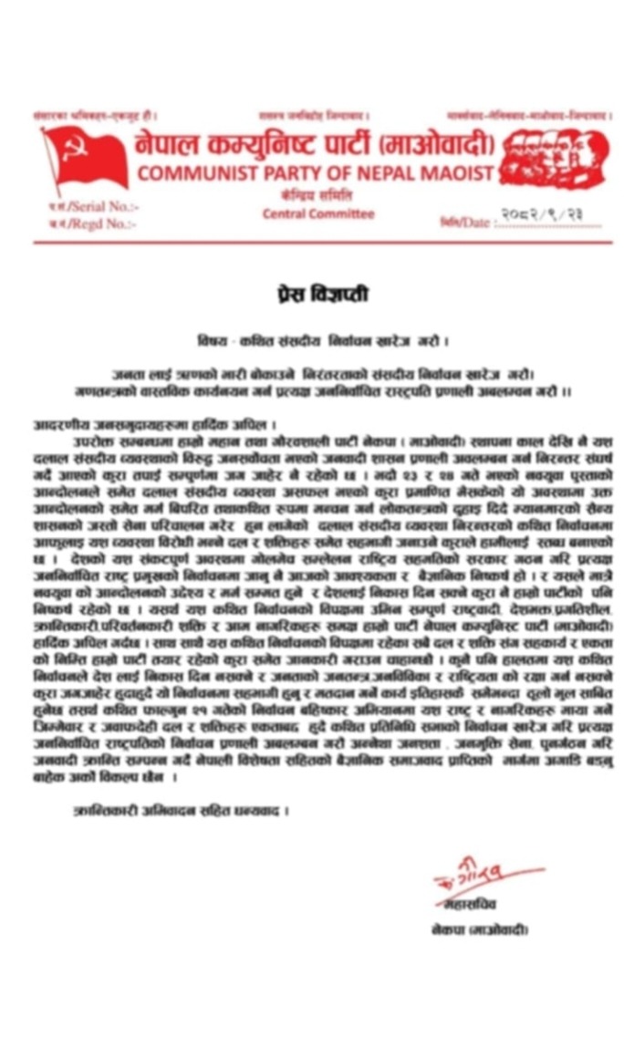 काठमाडौँ, पुस – २३ । नेपाल कम्युनिष्ट पार्टी (माओवादी) ले सरकारको पछिल्लो गतिविधिलाई जनविरोधी, दमनकारी र अलोकतान्त्रिक भन्दै कडा विरोध जनाएको छ।