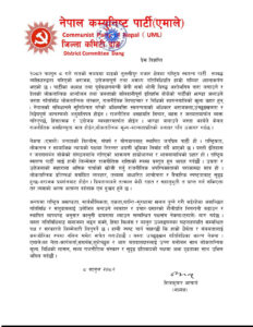विज्ञप्तिमा एमालेको धैर्यता र संयमतालाई कमजोरीका रूपमा नलिन सचेत गराउँदै यस्ता गतिविधि गर्नेलाई कानुनी दायरामा ल्याउन स्थानीय प्रशासनसँग माग गरिएको छ।