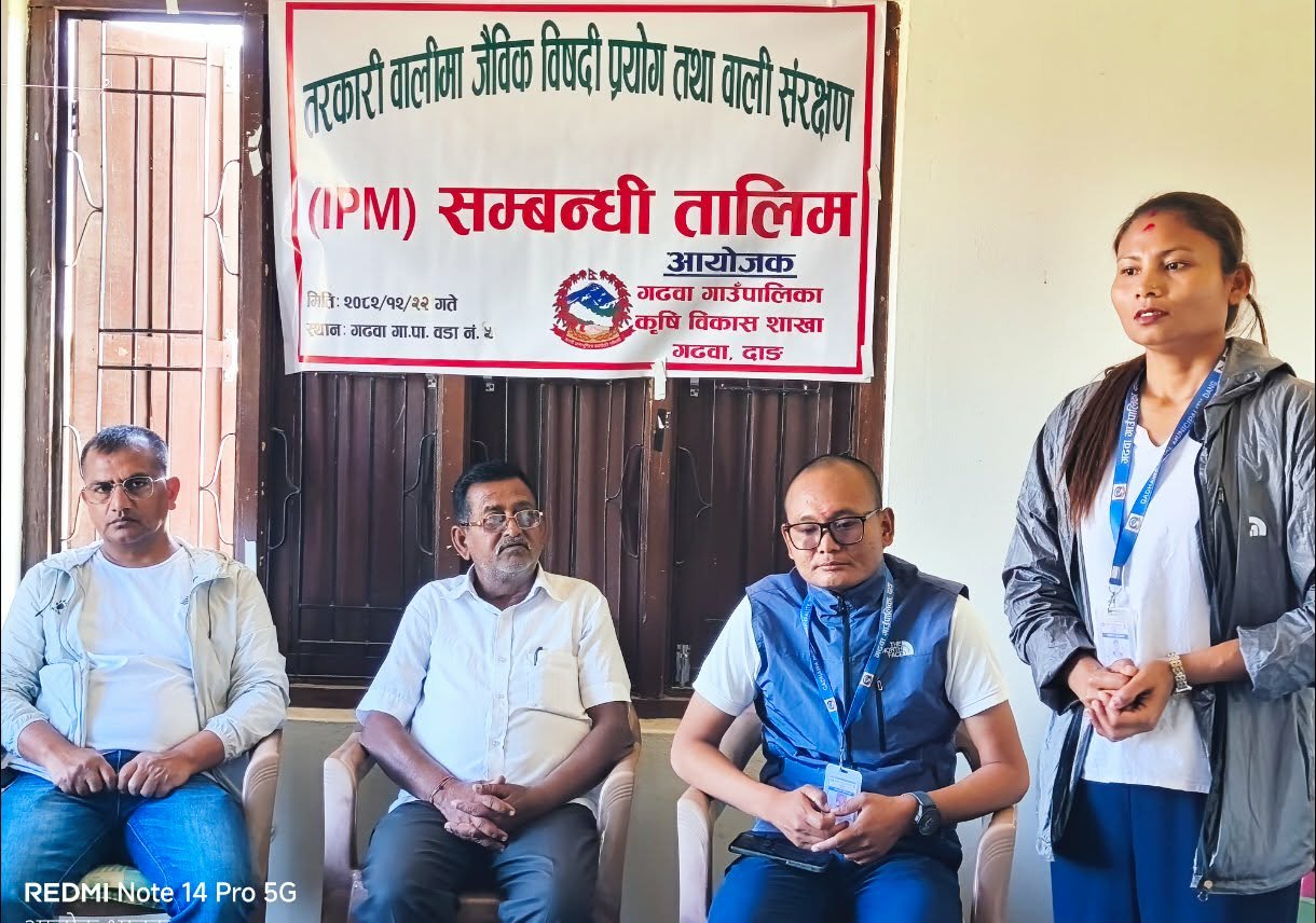 गढवा, २२ चैत्र। दाङ देउखुरीको गढवा गाउँपालिका–५ बाकीमा तरकारी बालीमा जैविक विषादी प्रयोग तथा बाली संरक्षण (आईपिएम) सम्बन्धी तालिम सम्पन्न भएको छ।