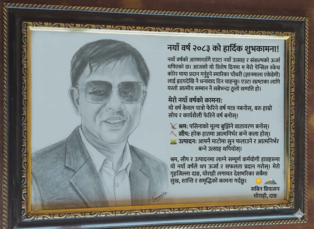 नयाँ वर्षको आगमनसँगै एउटा नयाँ उत्साह र संकल्पको ऊर्जा थपिएको छ। आजको यो विशेष दिनमा म मेरो पेन्सिल स्केच कोरेर माया प्रदान गर्नुहुने स्मारिका चौधरी (ज्ञानमाला एकेडेमी) लाई हृदयदेखि नै धन्यवाद दिन चाहन्छु। एउटा स्रष्टाका लागि यस्तो आत्मीय सम्मान नै सबैभन्दा ठूलो सम्पत्ति हो।