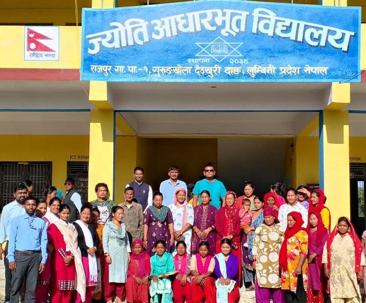 देउखुरी,२६ चैत्र। राजपुर गाउँपालिका–१ गुरुङखोलामा अवस्थित ज्योति आधारभूत विद्यालयमा आज एक विशेष कार्यक्रमका बीच विद्यालय सुधार तथा अभिभावक भेला भव्य रूपमा सम्पन्न भएको छ। शिक्षा क्षेत्रको समग्र सुधार, विद्यार्थीको भविष्य सुनिश्चितता र गुणस्तरीय शिक्षाको विस्तार गर्ने उद्देश्यले आयोजना गरिएको उक्त कार्यक्रममा स्थानीय अभिभावक, शिक्षक, जनप्रतिनिधि तथा सरोकारवाला निकायहरूको उल्लेख्य सहभागिता रहेको थियो।